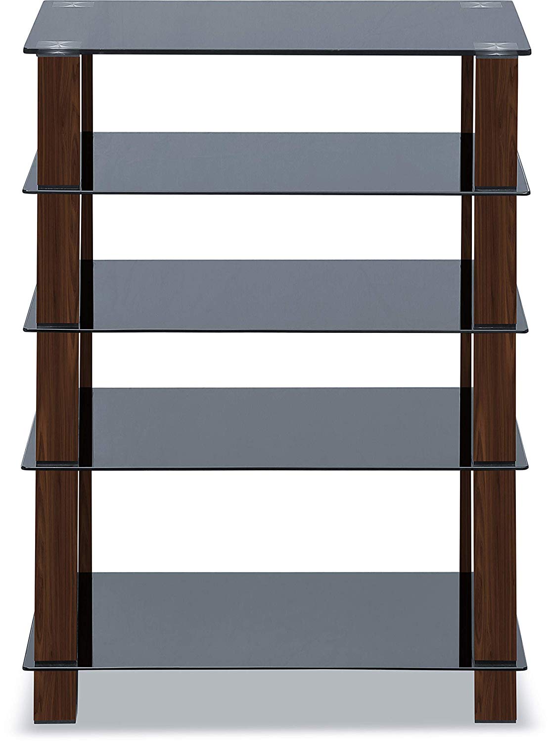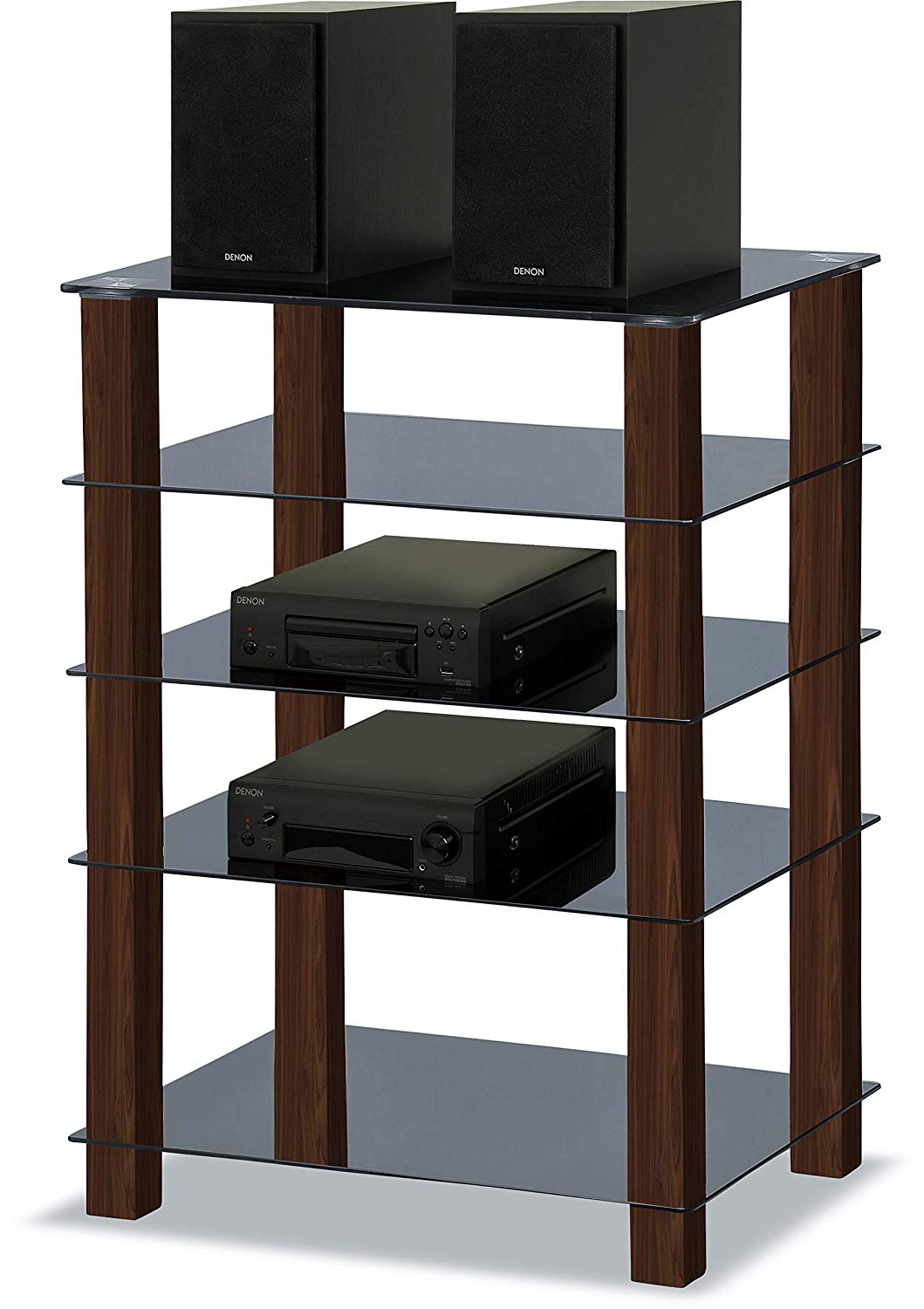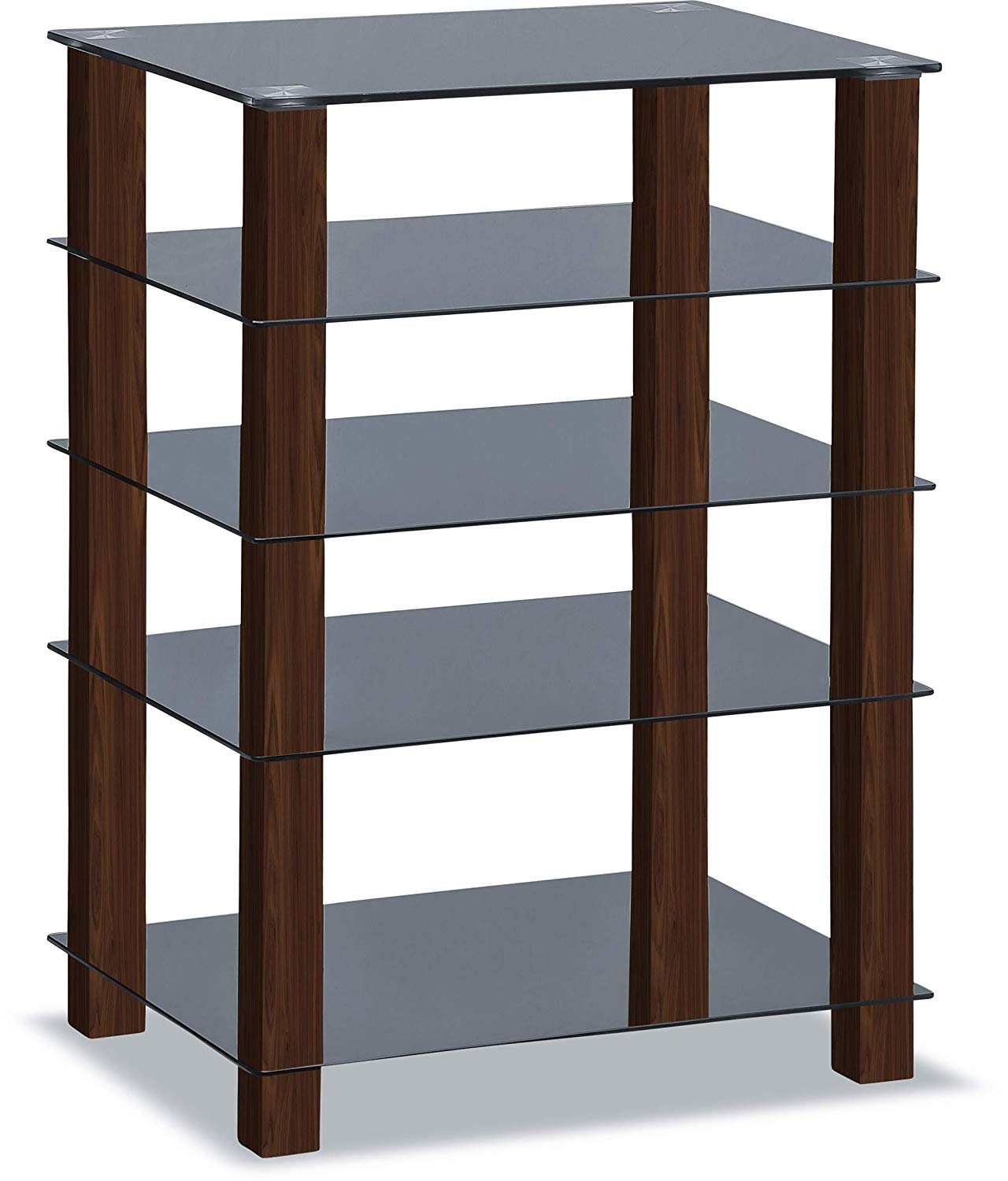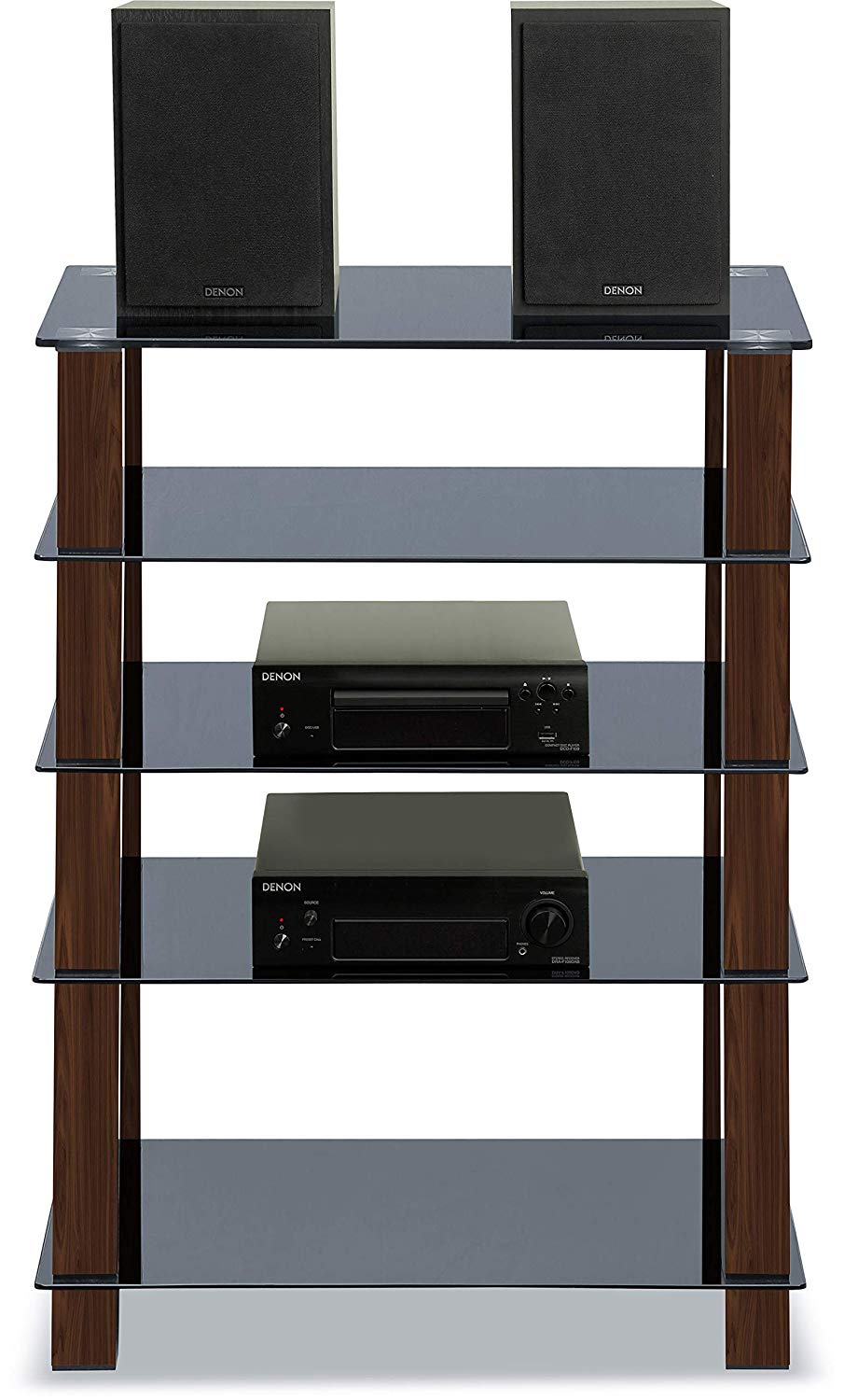 Centurion Supports TRINITY Gloss Black 5 Shelf with Walnut Legs Flat Screen TV Rack Glass Stand