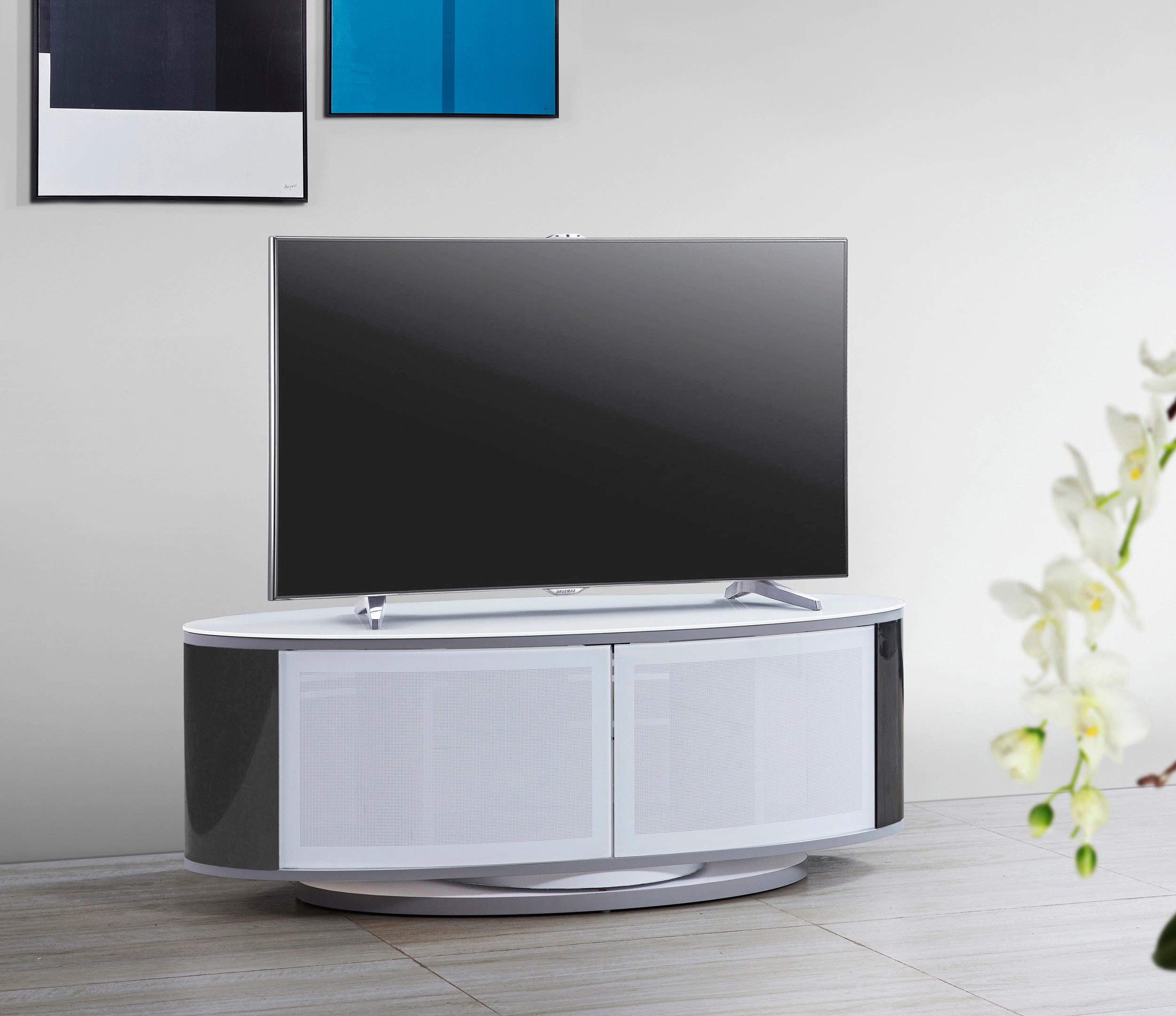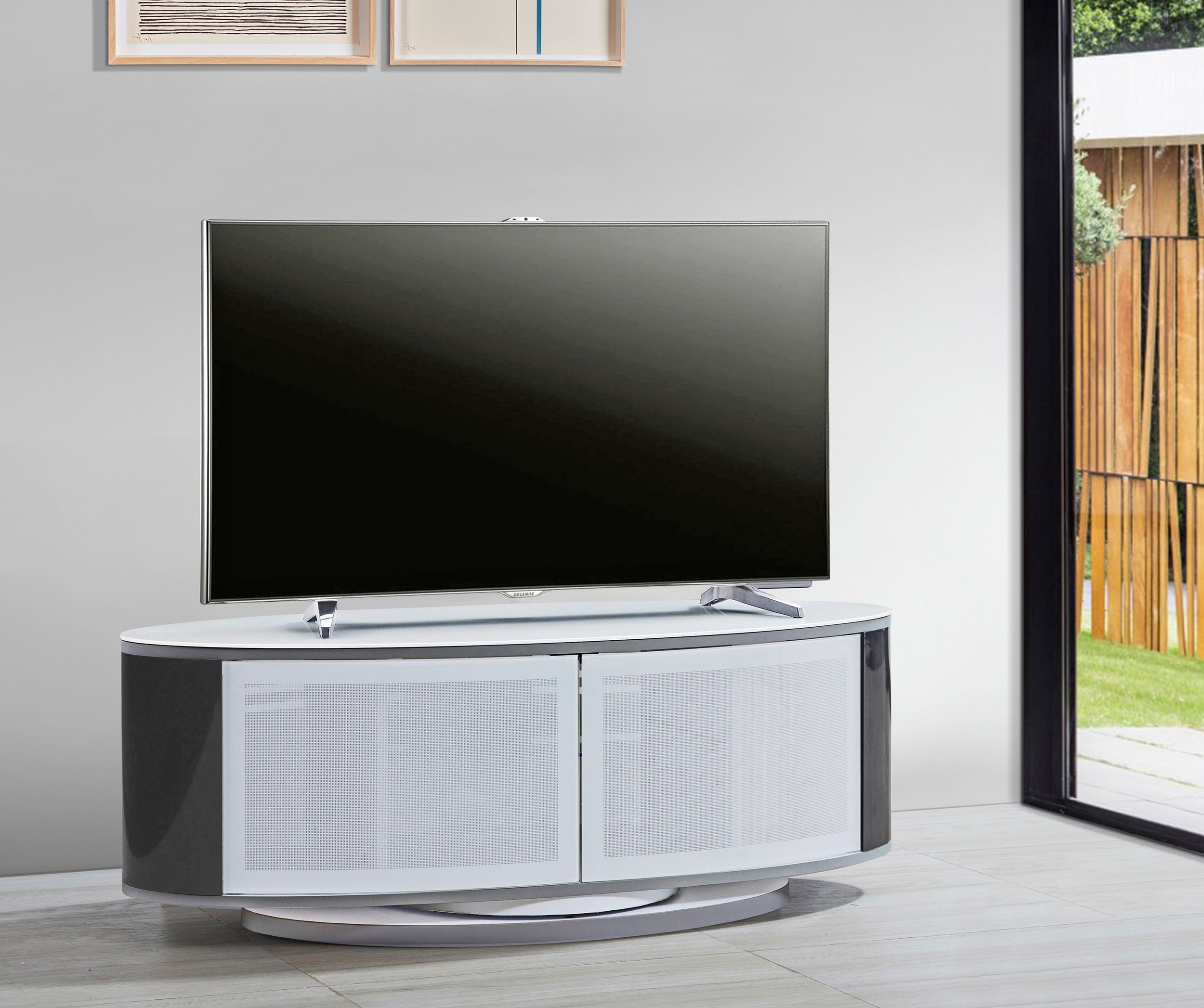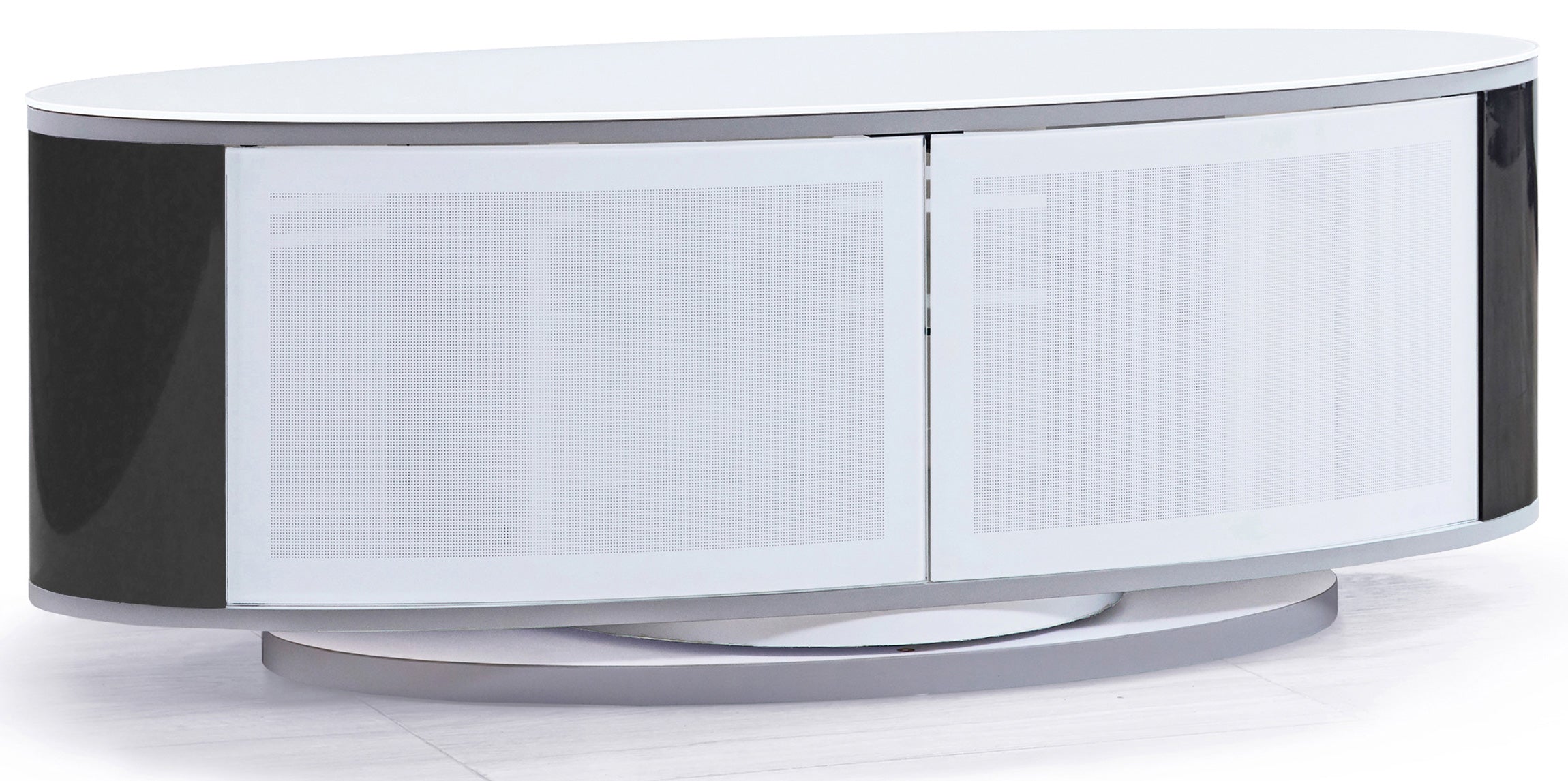 MDA Designs LUNA Gloss White Oval Cabinet with Black Profiles and White BeamThru Glass Doors Suitable for Flat Screen TVs up to 50"