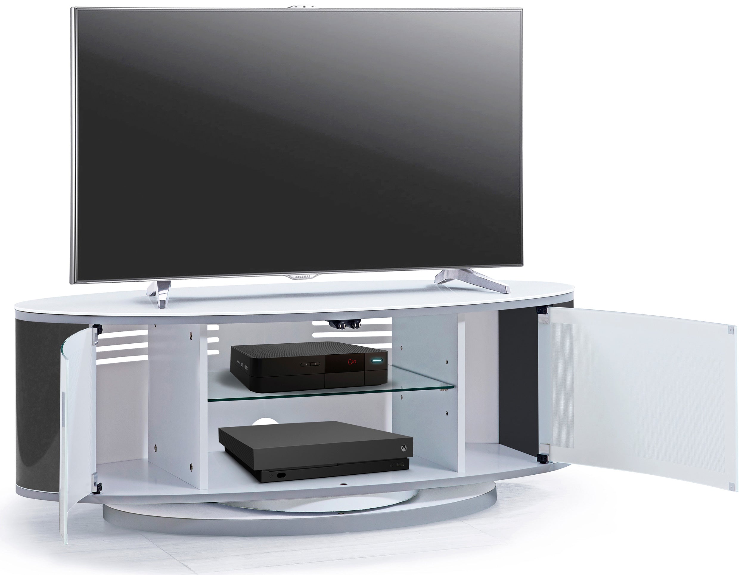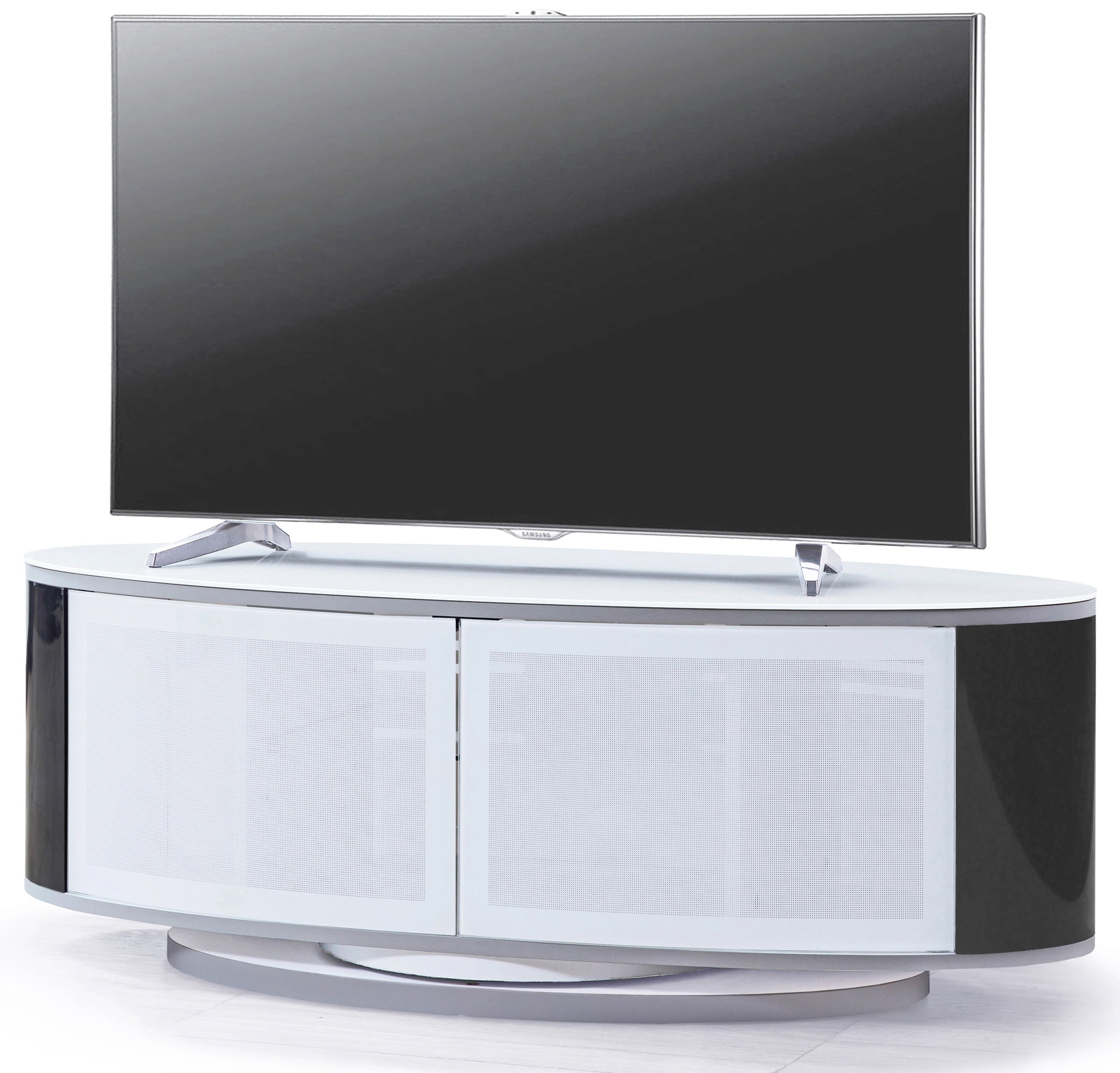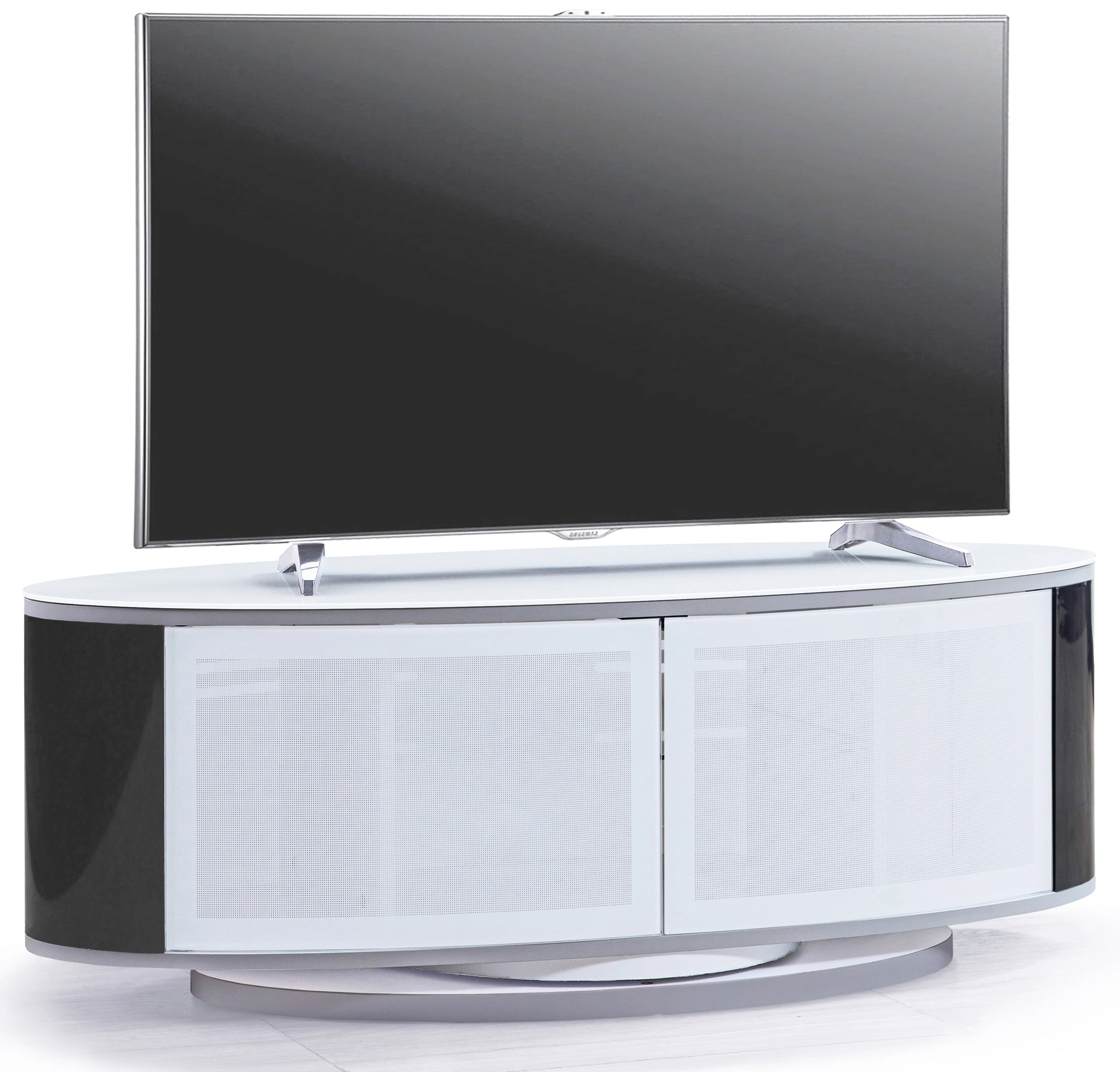 MDA Designs LUNA Gloss White Oval Cabinet with Black Profiles and White BeamThru Glass Doors Suitable for Flat Screen TVs up to 50"