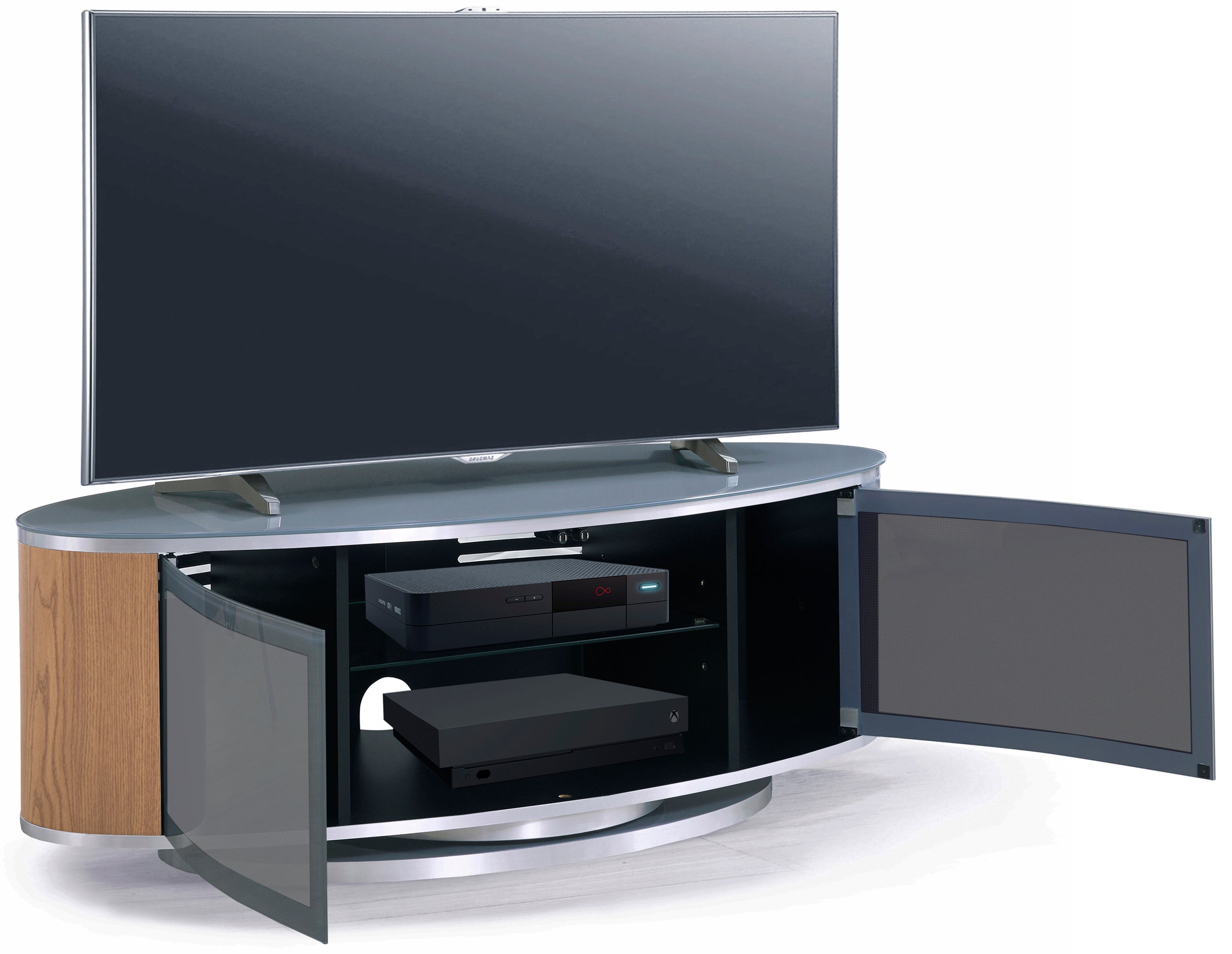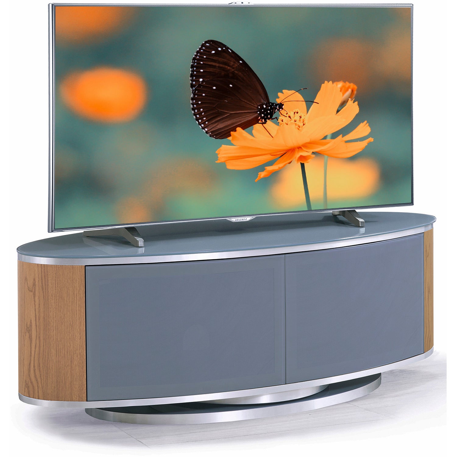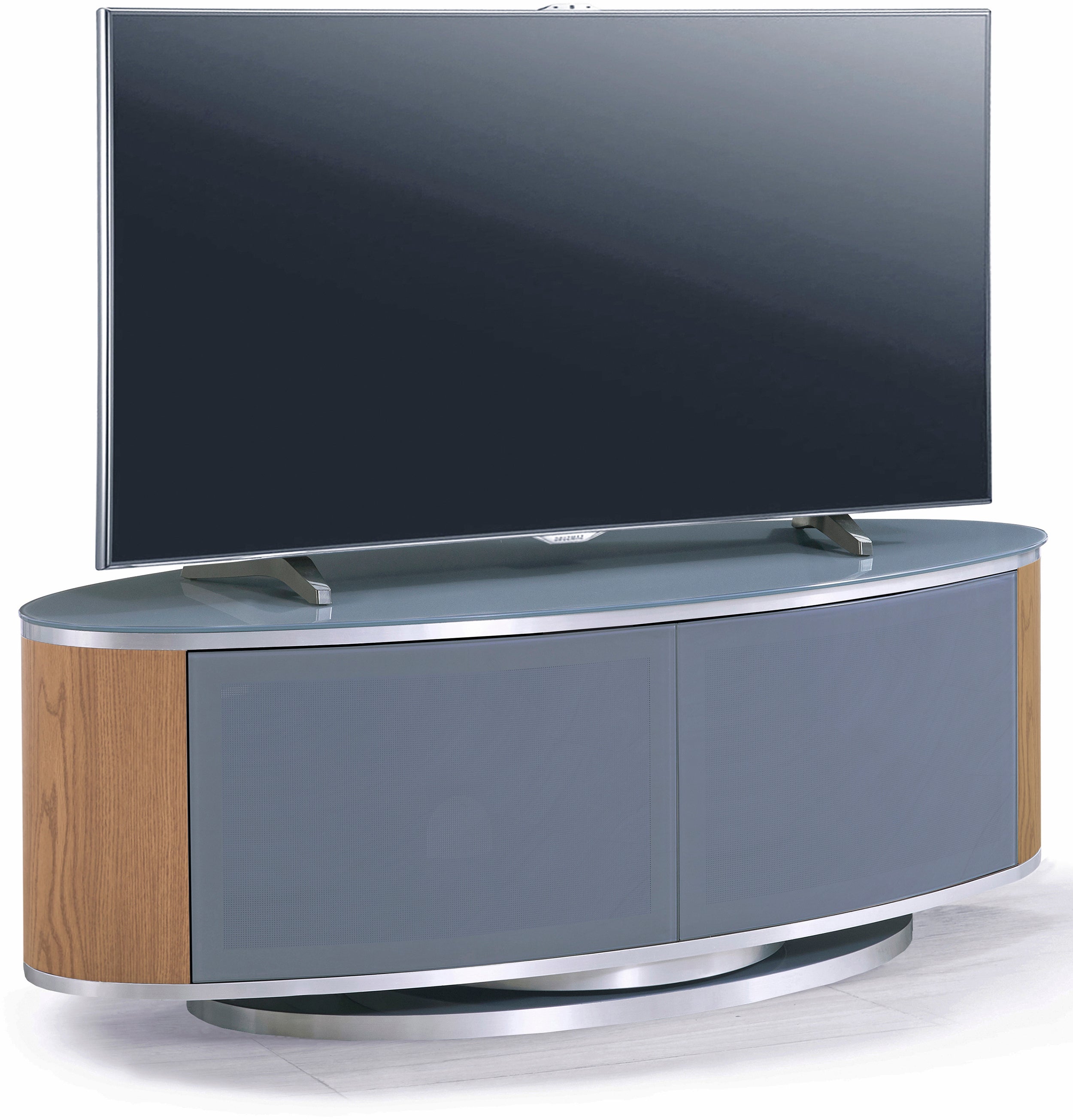 MDA Designs LUNA Grey Oval Cabinet with Oak Profiles & Grey BeamThru Glass Doors Suitable for Flat Screen TVs up to 50"