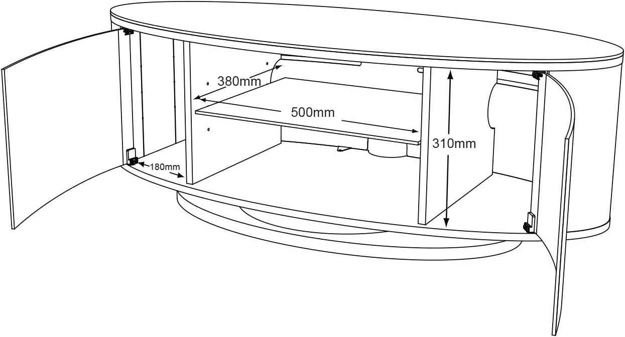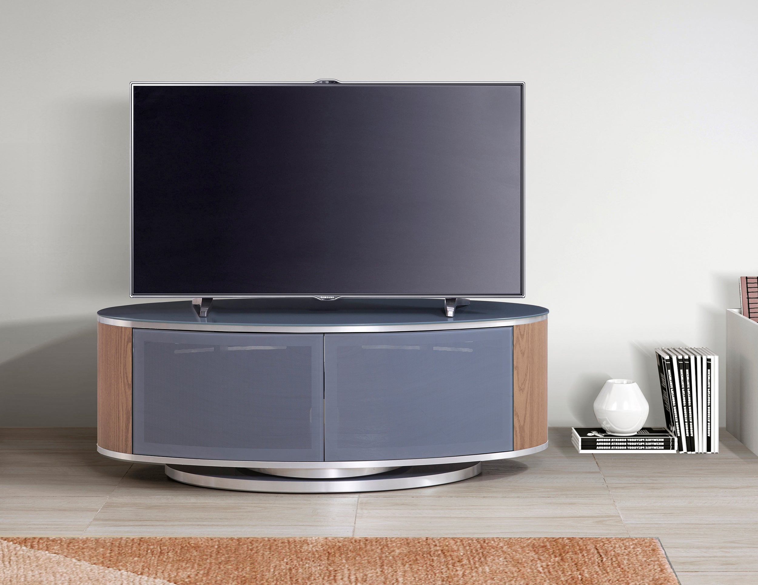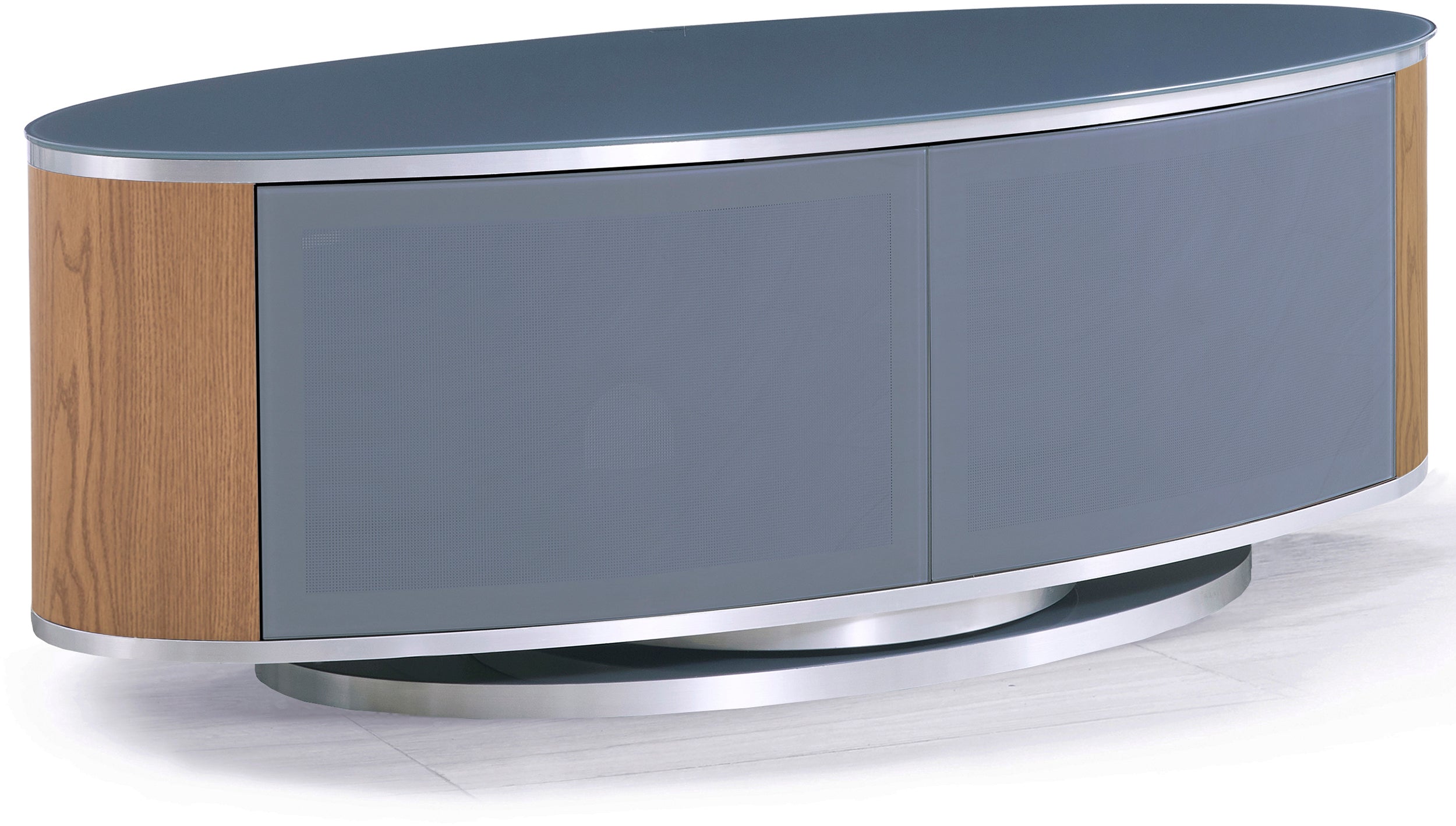 MDA Designs LUNA Grey Oval Cabinet with Oak Profiles & Grey BeamThru Glass Doors Suitable for Flat Screen TVs up to 50"