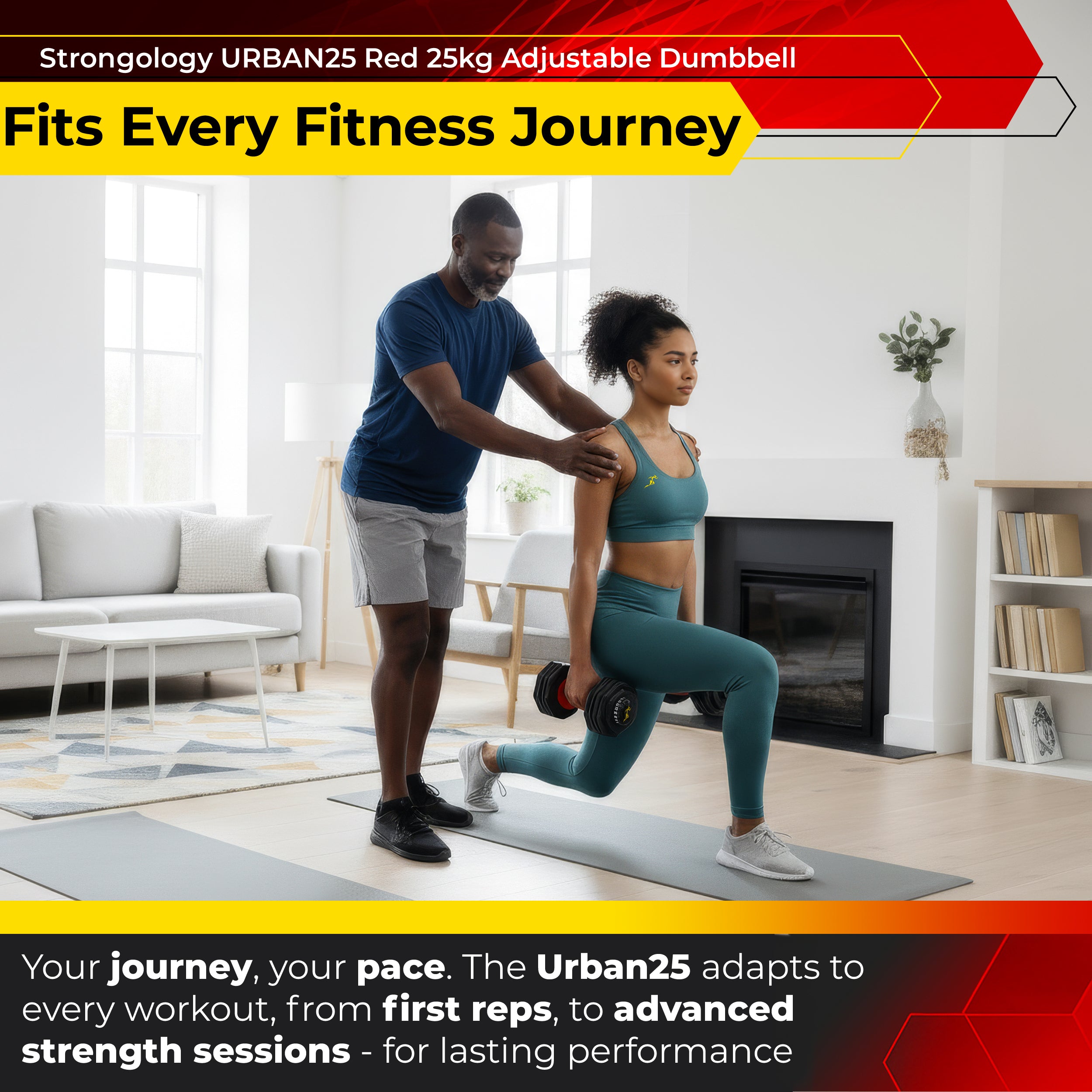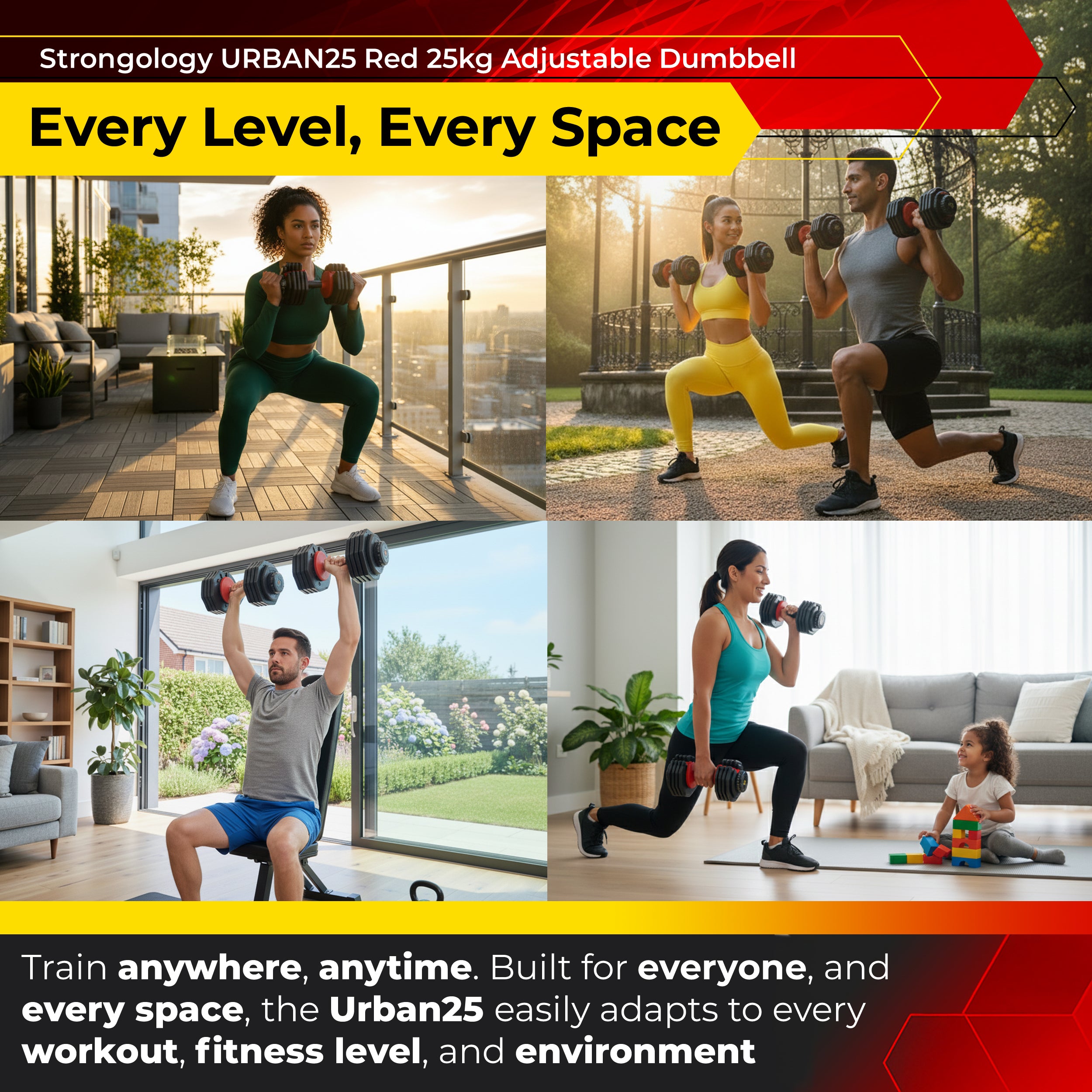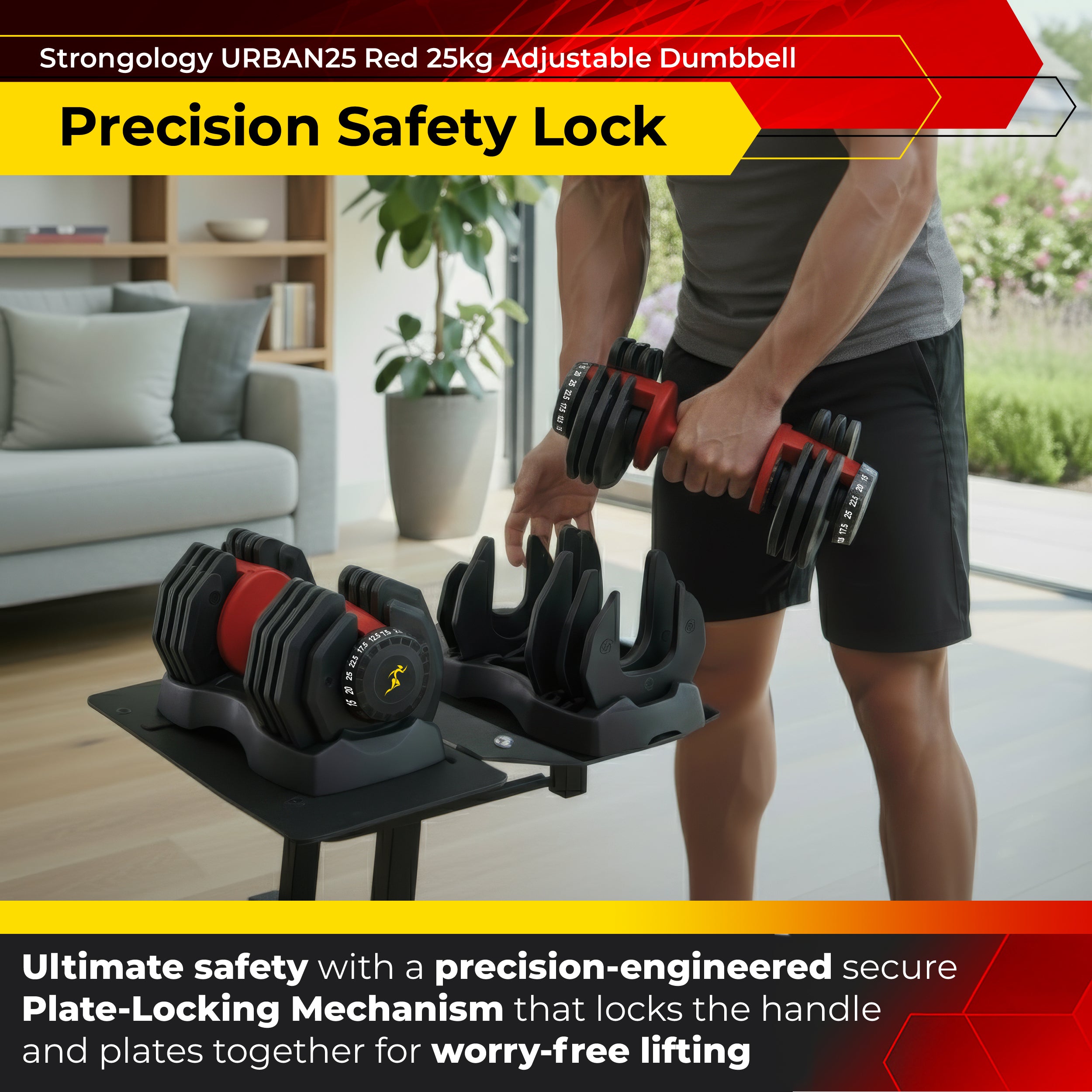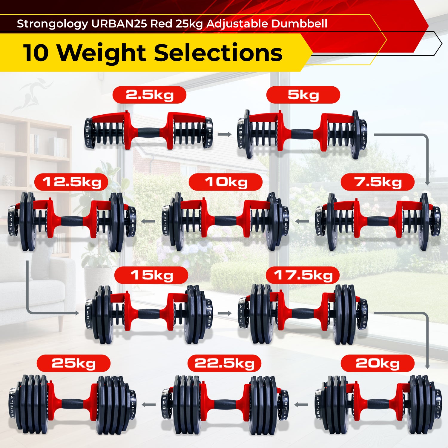 Strongology URBAN25 Red Adjustable Dumbbell Pair | 2.5kg to 25kg Quick-Select Weight | 10-in-1 Space-Saving Design | Soft-Grip Handle | Secure Plate-Locking System | Home Gym Strength Training Workouts