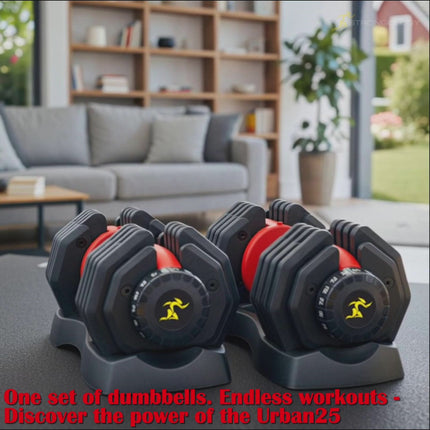 Strongology Urban25 Pair Home Fitness Black Red Adjustable Smart Dumbbells from 2.5kg up to 25kg Training Weights